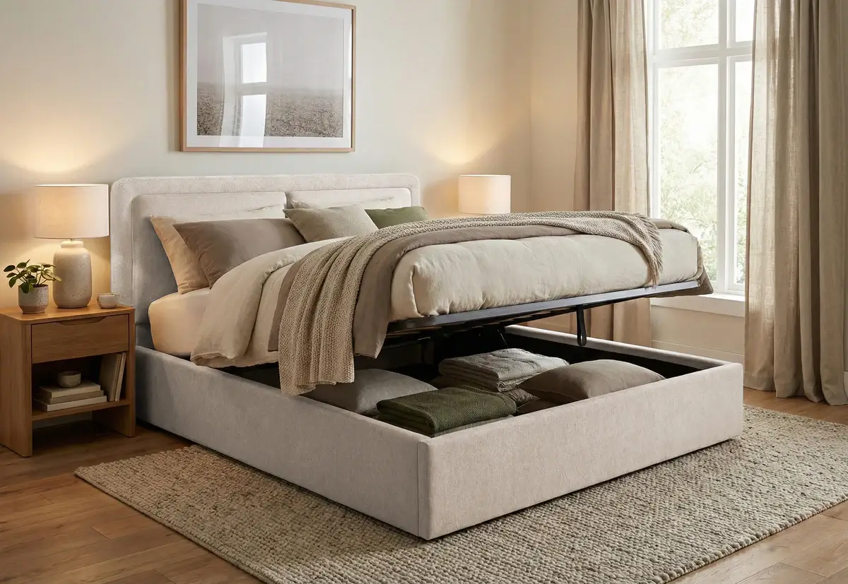 Un sistem cu ladă de depozitare poate oferi chiar și 500–800 litri de spațiu, echivalentul unui dulap mic. În multe cazuri, mecanismul de ridicare al saltelei este asistat de pistoane cu gaz, ceea ce face accesul foarte ușor. Pentru cei care au deja un pat simplu, există și variante de cutii de depozitare care se glisează sub pat și pot fi scoase rapid atunci când este nevoie.