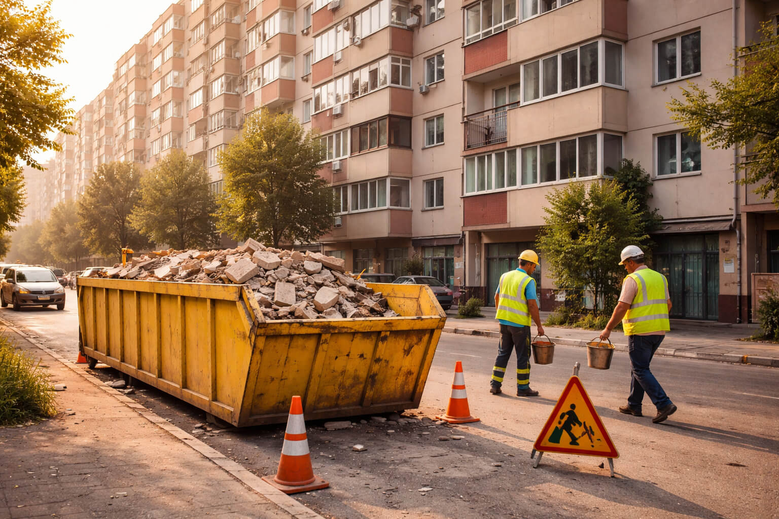 În fața blocului se întâmplă, de obicei, una dintre două situații. Prima e renovarea unui apartament, cu moloz, faianță, tencuială, bucăți de rigips, uși vechi, resturi care nu au ce căuta în pubela de menajer. A doua e o lucrare la spații comune sau la rețele, ceva care implică mai mulți oameni și, uneori, o firmă de construcții.